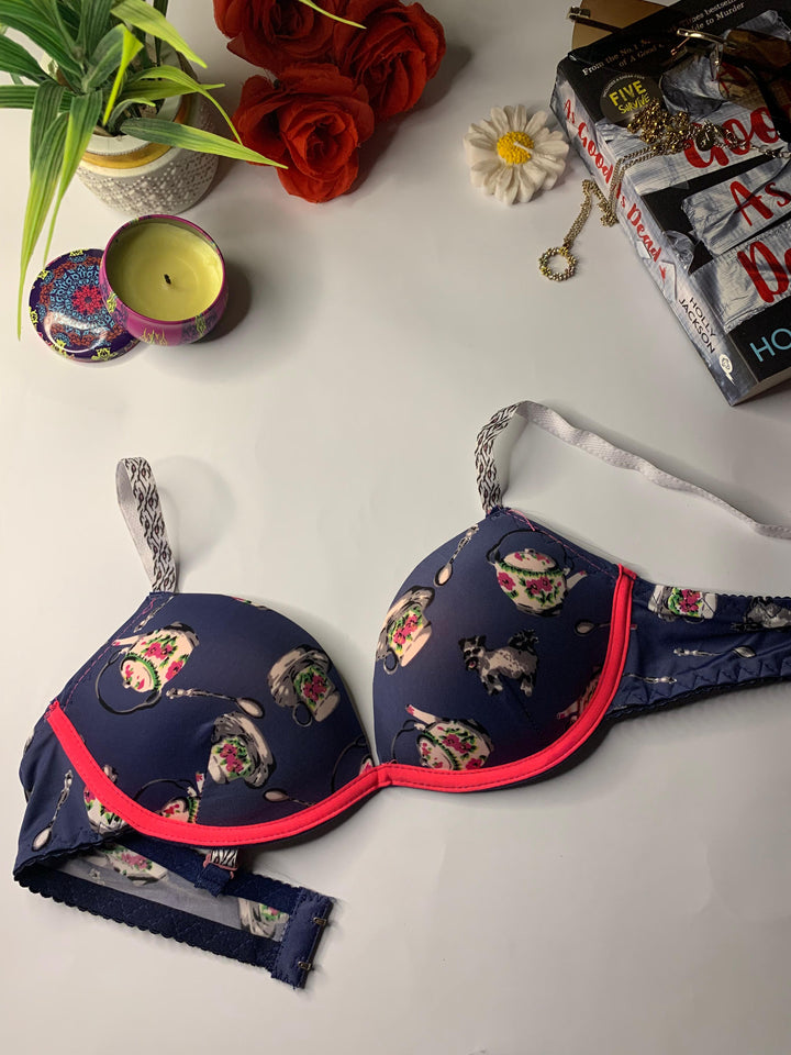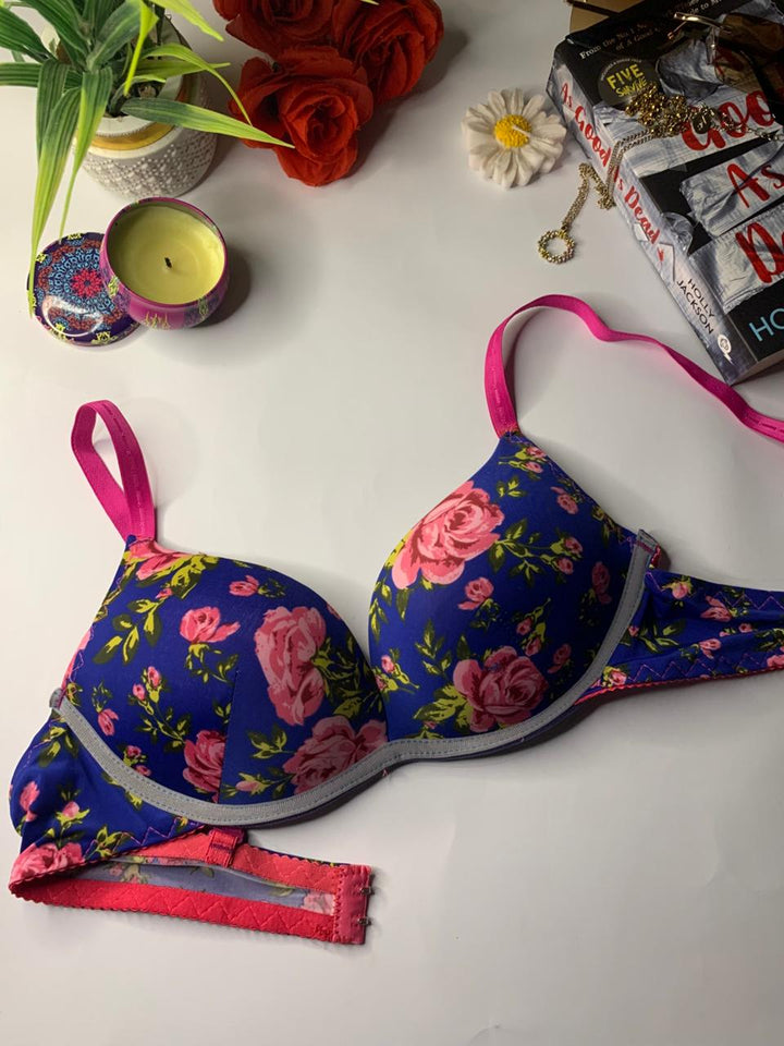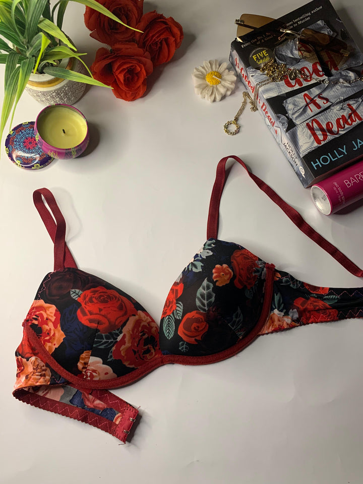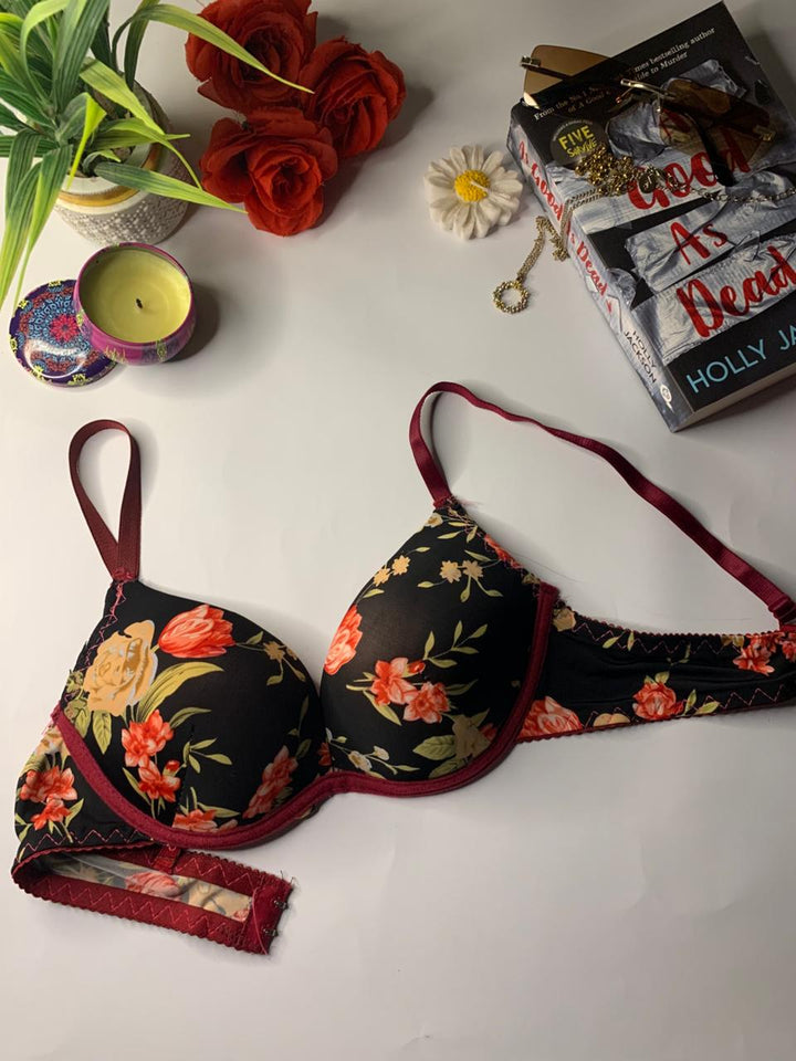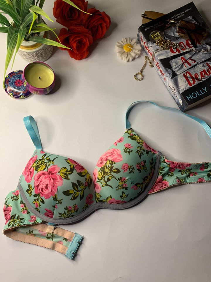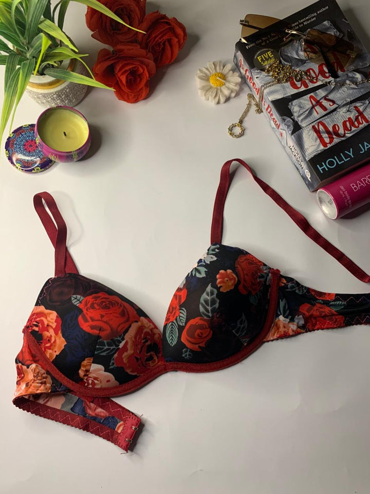 This bra is stylish bold floral design. It features underwired, lightly padded cups and adjustable shoulder straps. The bra appears to be an underwire style, a common design for everyday support. Perfect for daily wear.