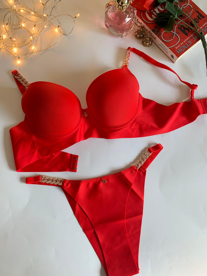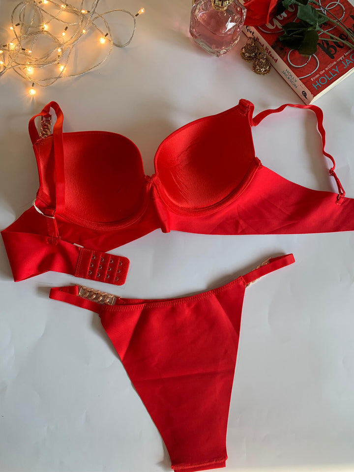 Elevate your intimate moments with our stunning red lingerie set, featuring delicate gold accents and a touch of romance. This exquisite set includes a bra and panties, carefully crafted to make you feel confident and beautiful.