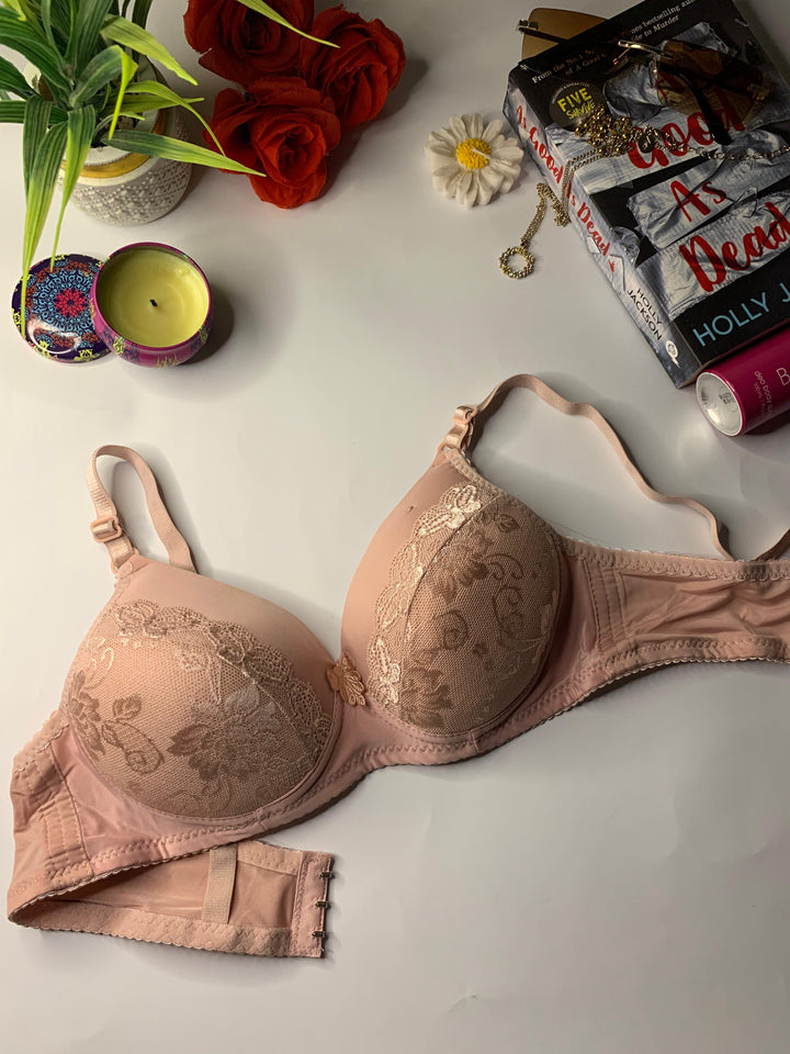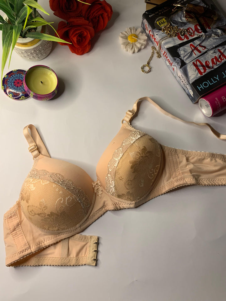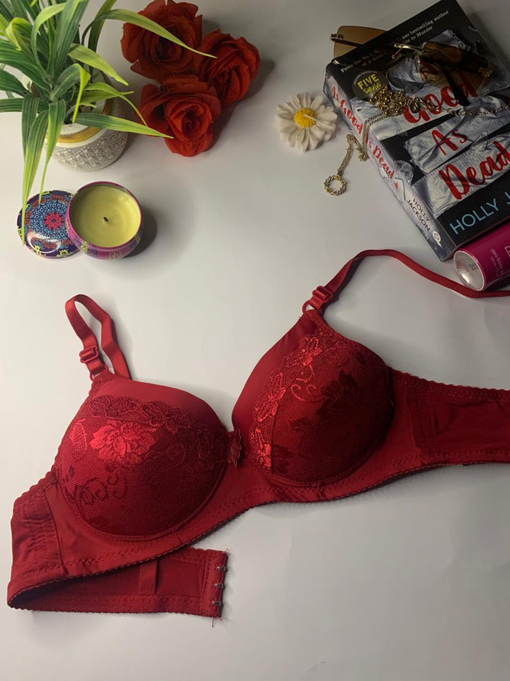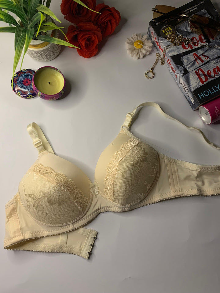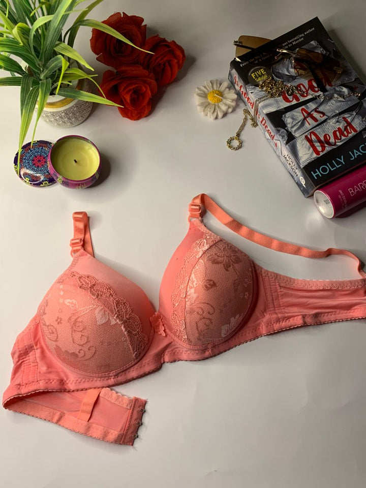 The bra features delicate lace details on it. It is wire-free, provides full coverage, has adjustable straps, and is designed to be comfortable for everyday use. It is soft-padded and gives a perfect shape