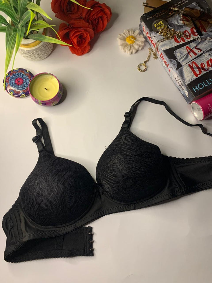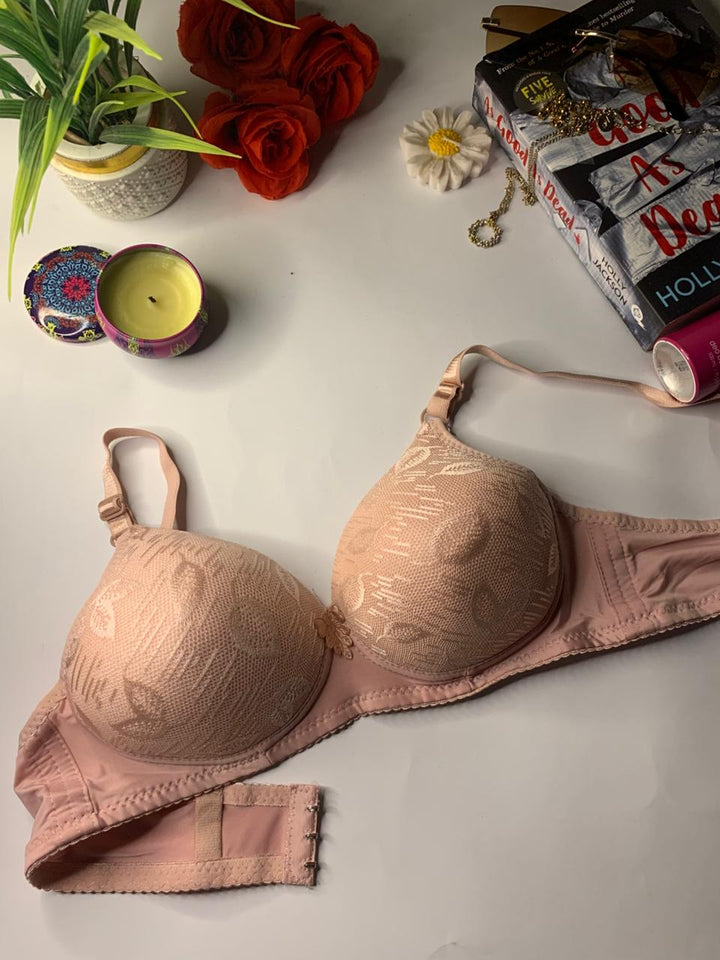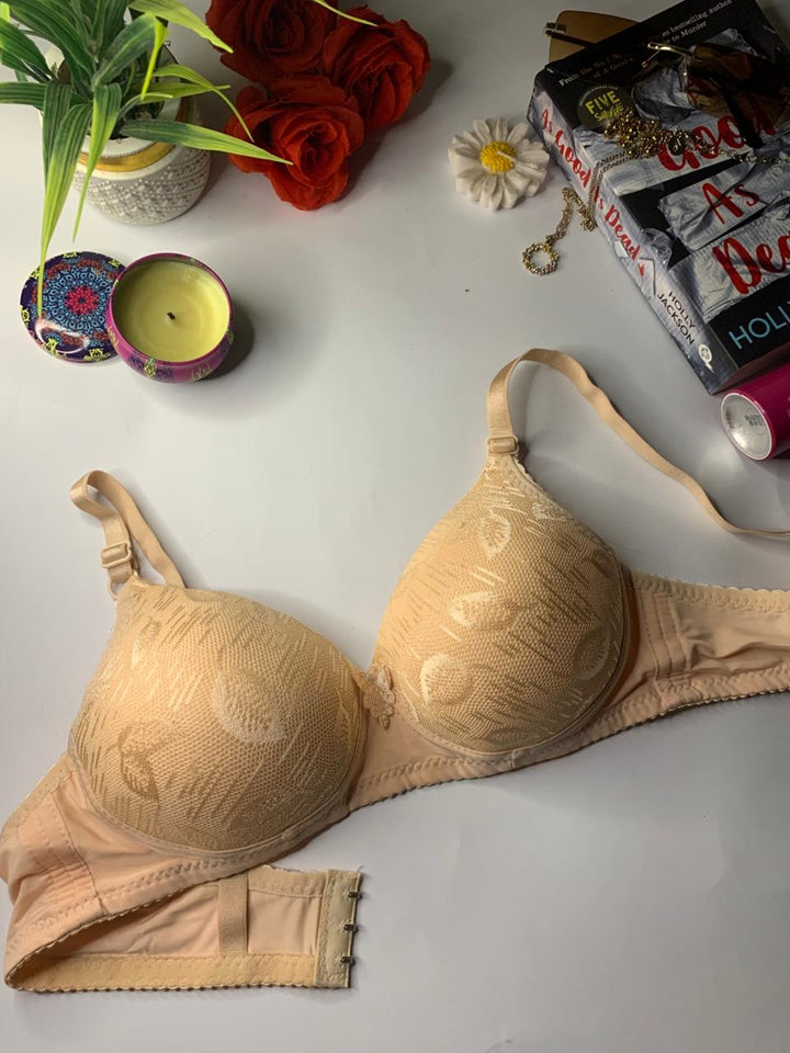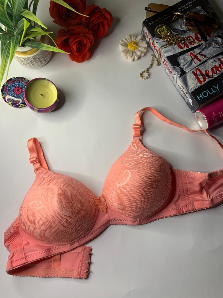 The bra has a textured floral design overlaid on the cups. The cups appear to be foam-padded, designed for comfort and to prevent nipple show-through. It has adjustable shoulder straps and is perfect for daily wear.